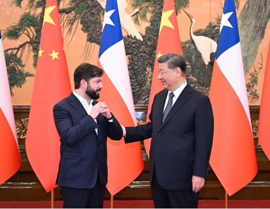 博里奇表示,智利高度重视对华关系。中国已成为智利最重要的贸易伙伴,双方合作造福了两国人民。智方将坚定奉行一个中国原则,期待与中方进一步拓展贸易、投资、人工智能等领域合作,高质量共建“一带一路”,密切人文交流,推动智中关系取得更多实实在在的成果。各国应坚持自由贸易和互利共赢,贸易不应只服务于一国私利,发动贸易战没有出路。智方愿同中方一道,坚定捍卫多边主义和联合国权威,坚持通过对话解决分歧,共同维护国际公平正义。
