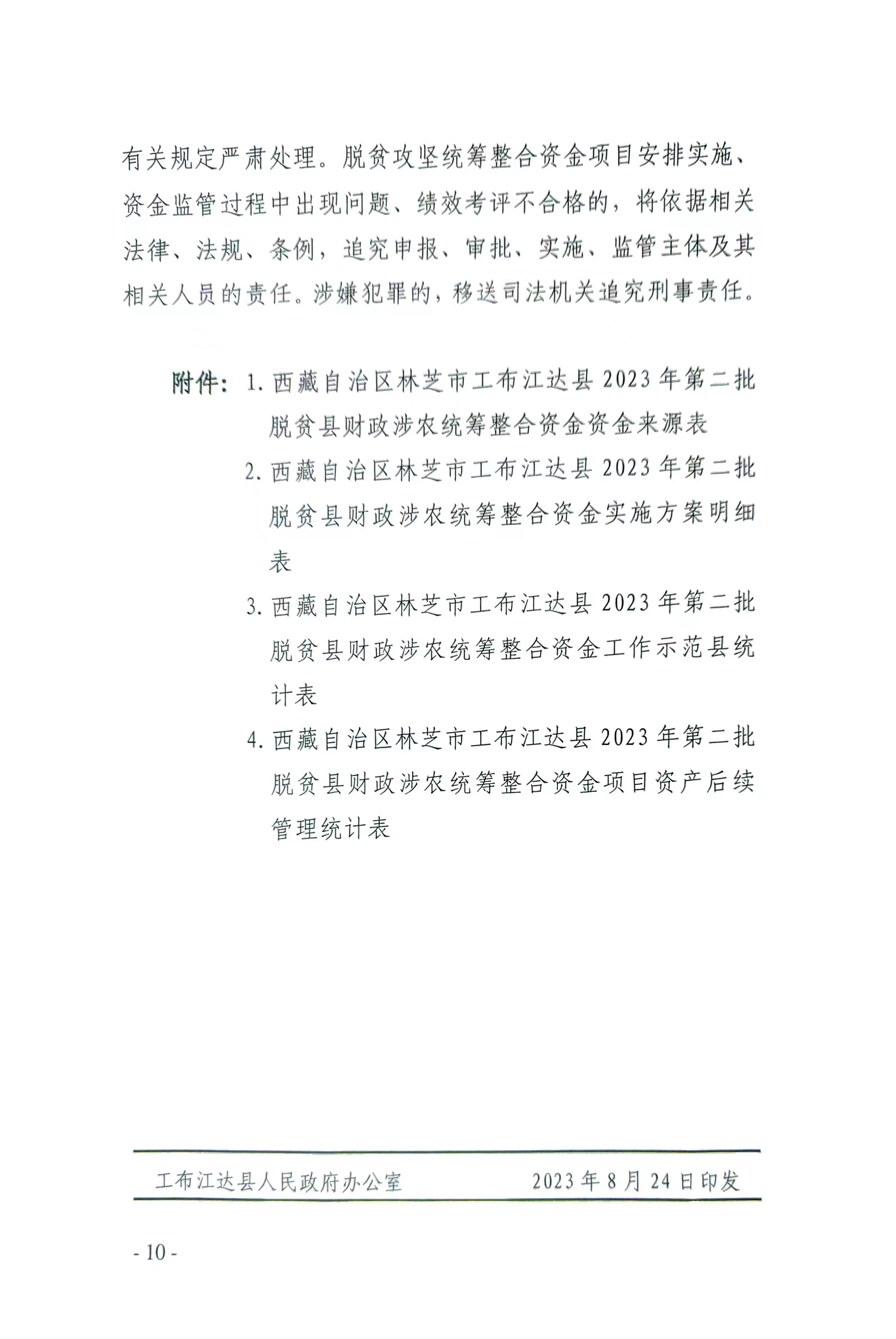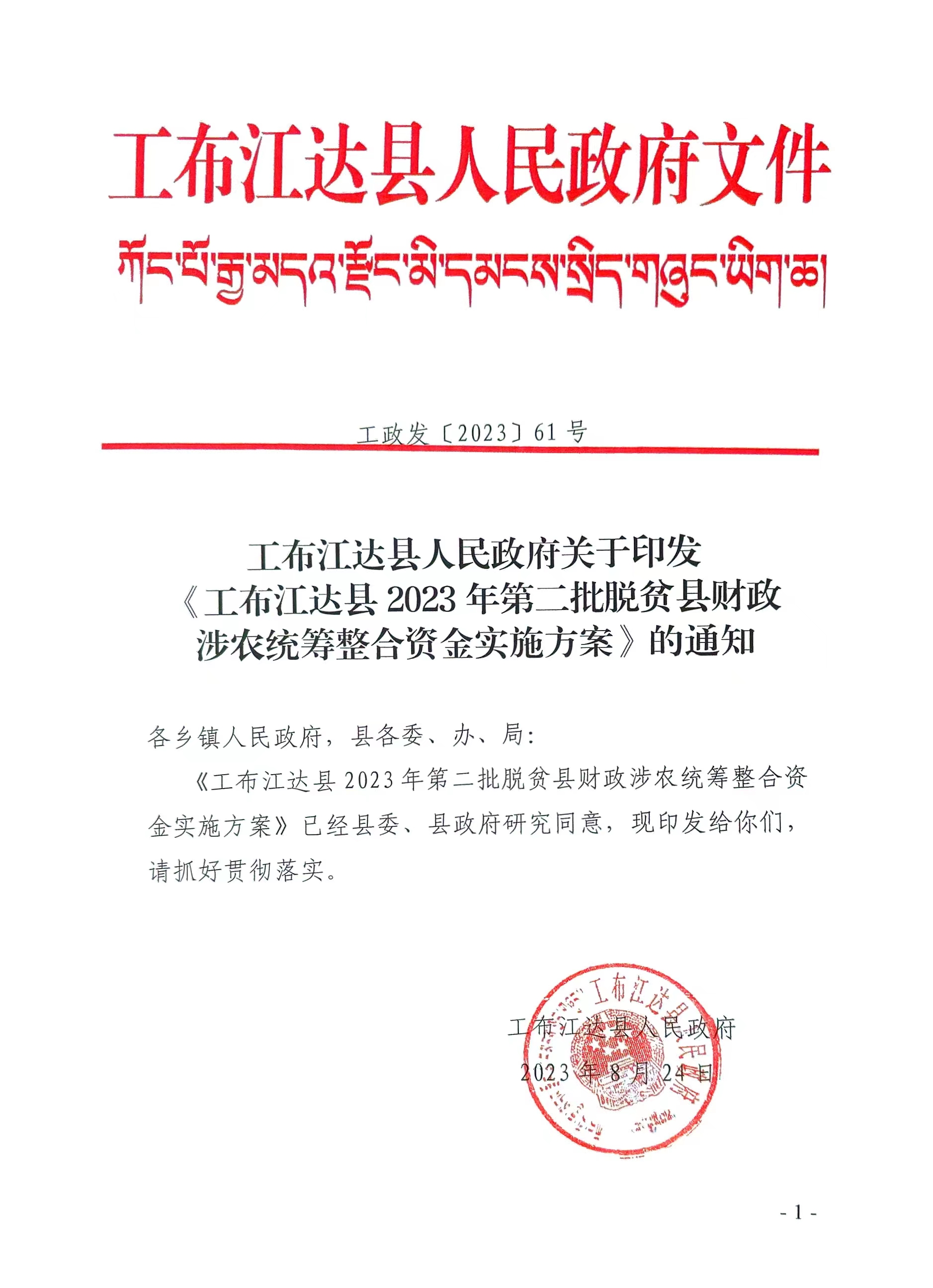 工布江达县人民政府关于印发《工布江达县2023年第二批脱贫县财政涉农统筹整合资金实施方案》的通知