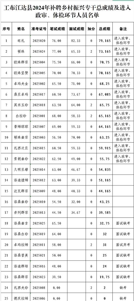 附件:工布江达县2024年补聘乡村振兴专干总成绩及进入政审、体检环节人员名单