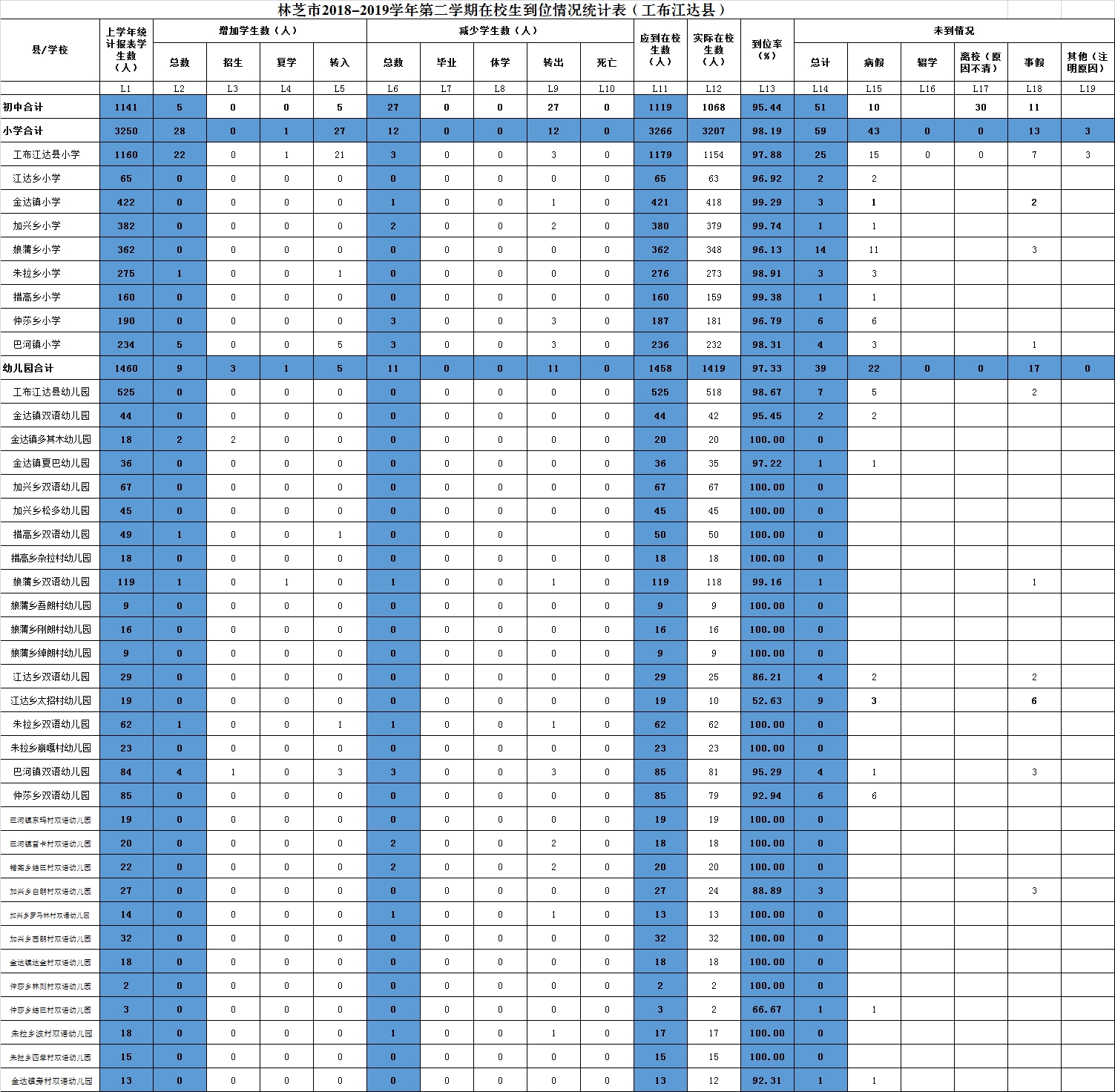 工布江达县2018-2019学年第二学期在校生到位情况统计表