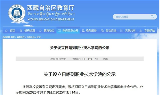 3月10日,西藏自治区教育厅发布《关于设立日喀则职业技术学院的公示》。按照高校设置有关规定及要求,现将拟设立日喀则职业技术学院事项向社会公示。