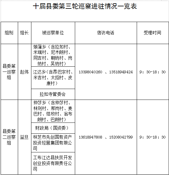 根据安排,各县委巡察组将在被巡察单位工作2个月左右,期间设立信访电话和举报箱,主动受理反映被巡察党组织领导班子及其成员、下一级党组织及其主要负责人和重要岗位领导干部问题线索的来信来电来访,重点是关于违反政治纪律、组织纪律、廉洁纪律、群众纪律、工作纪律和生活纪律等方面的举报和反映。十届县委第三轮巡察信访受理时间截止到2022年12月28日。