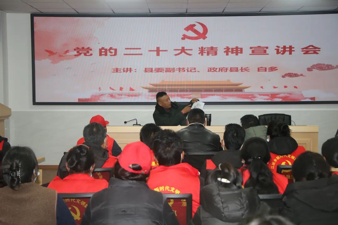11月14日,县委副书记、政府县长白多前往江达乡太昭村宣讲党的二十大精神。村“两委”班子、驻村工作队、基层党员群众代表共计40余人参加。