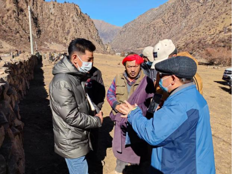 在雪朗村,胡洪青来到田间地头,与农牧民群众进行面对面交谈,详细了解了三岩搬迁点耕地水渠灌溉建设情况,并对在场人员进行党的二十大精神宣讲。